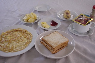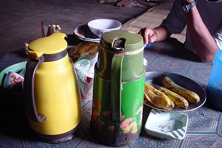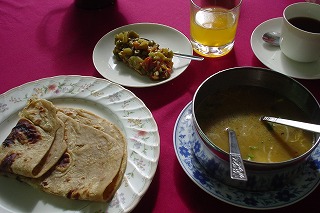 客は私一人だけで朝食は近くの店でインドのチャパティーとモヒンガーをテイクアウトしてきてくれました.