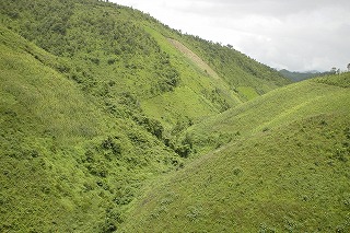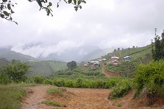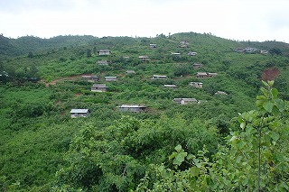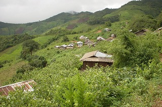 山越え谷越えていくと集落にでた.山の斜面に点在する家屋.ここまで車などは入ってこれない.カローから1時間40分.