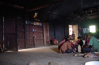 カローから2時間20分.雨の時折降る中,山越え谷越え川も渡渉し,パラウン族の村タヨー村へ到着.1棟に7家族が住むというロングハウス,長屋におじゃましてガイド氏が持参の昼食(大量のチャパティー)を食べる.