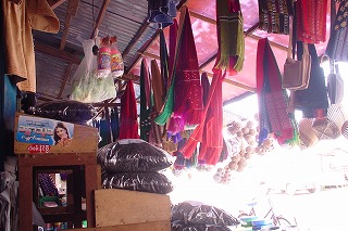 お茶の葉やシャンバックを扱う雑貨店.料金交渉に入る.ピンダヤからウンバンまで9000K.臨時出費である.これだけの金額ならピンダヤのホテルにも泊まれるかもしれないが(高いところが多いらしい),今泊まっているところと2重に払うのもしゃくだったのでチャーターにした.