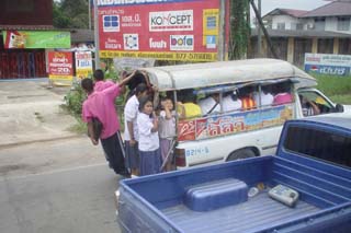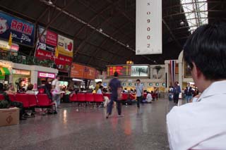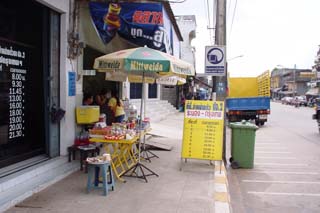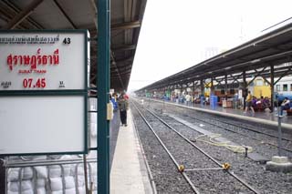 ![]() ![]() 翌朝,6時には食事に行く.併設のレストランで食事がついている.食堂はお兄さんが一人で番をしていた.このホテル(旅社)の外観はかなりおんぼろ.でも中はきれい.アメリカンブレックファスト.トースト,卵など. ![]() 部屋からの眺め.右側の建築物は寺院だろうか.タイを感じさせる. ![]() 列車の時刻表をホテルの人に聞いたが持っていない,駅に行った方が良いといわれたので,徒歩10分ほどの駅へ時刻の確認に行く.英語版の時刻表ももらえるが主要駅と優等列車か載っていない.タイ語版の時刻表を持っている人がいたが,その方が詳しかった. 0745発の特急列車の予約が取れたので,チュンポンまで行きそこからバスでミャンマー国境ラノーンへ向かうことにした.また,ホテルに戻り,荷物を持ってくることにした. 駅からホテルまでの短い距離にも寺院があったり,托鉢に回っているお坊さんがいたり,準備にいそがしい屋台が並んでいたり,バンコクの朝の姿にすこし触れることができる. ![]() ホテルをチェックアウトし,駅に向かう.日本と違って改札は無く,ホームへの出入りは自由にできそうだ.電光掲示で出発ホームを確かめる.ホームに人はたくさん待っていたが,まだ列車が入線する気配は無いので,ジュースを買いに構内の売店に. 出発時刻に列車が入線してきた.どんな車両かと楽しみにしていたら,なんと2両編成のディーゼルカー.長い客車かと思ったが違う.また,ホームに待っていた人はすべてこの列車に乗るわけではなさそうだった. 早速乗り込み,指定された席へ.エアコン付で2等車.駅で食料とかを積み込んでいたが車内販売でもあるのか?と思っていたら,飛行機なみに車内のサービス.があった. 列車はバンコク市街では踏み切りが閉まるのに時間がかかりかなり駅外停車がおおい.これはバスよりも遅いのかもしれない. ![]() ![]() 隣の客は,タイ人のおじさんで沿線の解説をはじめた.で,これが私の会社だとか,次は何が見えるとか,に始まりタイ全土の観光案内に.どこどこでは何がおいしいとか.彼はタイ南部の家に列車とバスで帰るそうだ. ![]() ![]() 列車内はこんな感じ.ついでにトイレも.思ったより掃除が行き届いている. ![]() ![]() 風景は天然ゴムの木とアブラヤシの植林が延々と続く. 約7時間14時20分にチュンポン到着.ここで,次の行程の予定として2日後の当駅初マレーシアのバタワース行きを空席照会も満席.仕方ないので,タイ南部の都市,ハジャイまでのチケットを購入.結局このチケットは使わず無駄になってしまったが. 駅で,飛行機以外で初めて日本人に会った.彼はバックパッカーでマレーシアから北上してきているらしい.ちょうどラノーンからついて安宿を検索中だった.駅のお姉さんにラノーン行きのバス乗り場を聞いた.「歩き方」のマップと同じ場所を行っているようだ.モーターサイ(バイクタクシー)が彼はレーサーだなどと客引きしていたが,レーサーだと逆に飛ばして危険なのでは?などと思いつつ歩いていく.駅係員の説明どおりに木材屋を曲がるとバスターミナルらしきものを発見.しかし,なぜか閑散としており,窓口には誰もいない.バスなんか1台もいないしちがそうな雰囲気だ. 周囲をうろうろしたが,結局,バイクタクシーにのることに.どうやらここではなくて違うバスストップからラノーン行きは出るらしい.さすが「迷い方」だなと.しかし,駅の係員もここっていったのに.そこからは500mほど離れていた. ![]() ![]() 待合室には欧米人バックパッカーが数組と地元の利用客が数人.次のバスは16時で70B,支払いは車内らしい.バスは約50分遅れて到着,ここは始発ではないらしい. ![]() バスストップ. ![]() ソンテウ.かなり満員です. ![]() バスの車内.途中で客を拾ったり,おろしたりしている.運転手の気分で音楽がかかったり,VCDがかかったり. 約2時間でラノーンのバスターミナル終点に到着.降りると宿の客引きをかねたモーターサイドライバーが.私は特に当てが無かったので,値段を確認し,ついていった.トイレとシャワーは共同だったが,実質すいていたので占有できた. ![]() ![]() で,夕食だ.市場付近に屋台がたくさん出ていたので,タイ語がわからなくてもとりあえず注文できそうな屋台にした. NEXT コートーン タイ ミャンマー マレーシア旅行記目次 |